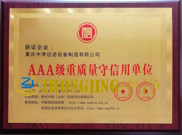 以上內容就是講的關于誠信單位證書:想了解更多相關的內容,請持續(xù)關注重慶中凈過濾設備制造有限公司網(wǎng)站,公司網(wǎng)編還會繼續(xù)更新真空濾油機相關的知識,歡迎來電咨詢與定制。